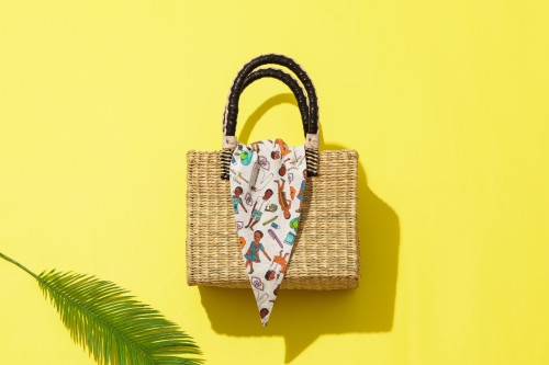 展開予定のカゴバッグはガーナの雇用創出の為、現地の伝統技術で一つ一つ手作りで生産されたもの。学校で勉強をする喜びを 見つけた子供たち、ガーナの民族衣装を身にまとったファッショナブルな女性たちを「Artist Lara」の世界観たっぷりに描いたデザイン のカゴバッグ、サコッシュ、iPhoneケースの3シリーズを展開。