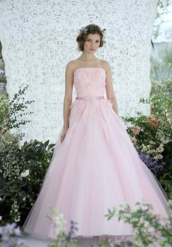 ・カラードレス:やっぱり着るなら、ピンクのカラードレス。艶や感のあふれるスパークオーガンジーの生地は花嫁様をより輝かせます