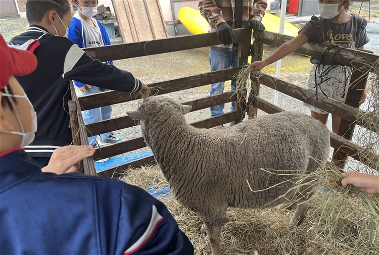 さとうみファームの特別授業の中で、南三陸わかめ羊へのエサやりも実施。ふれあい体験も行われ、和やかな雰囲気に包まれた授業となりました。