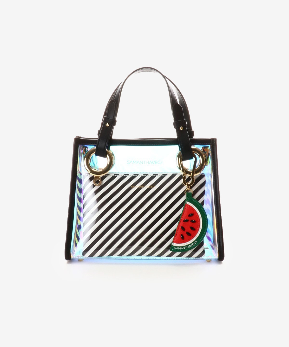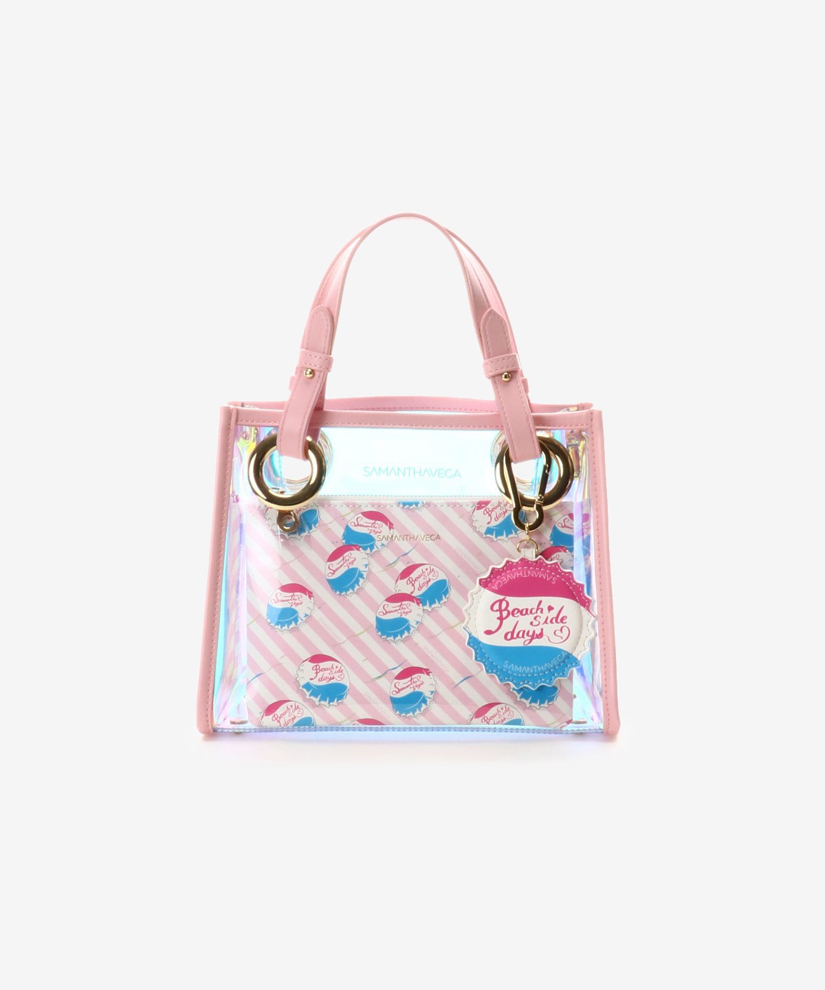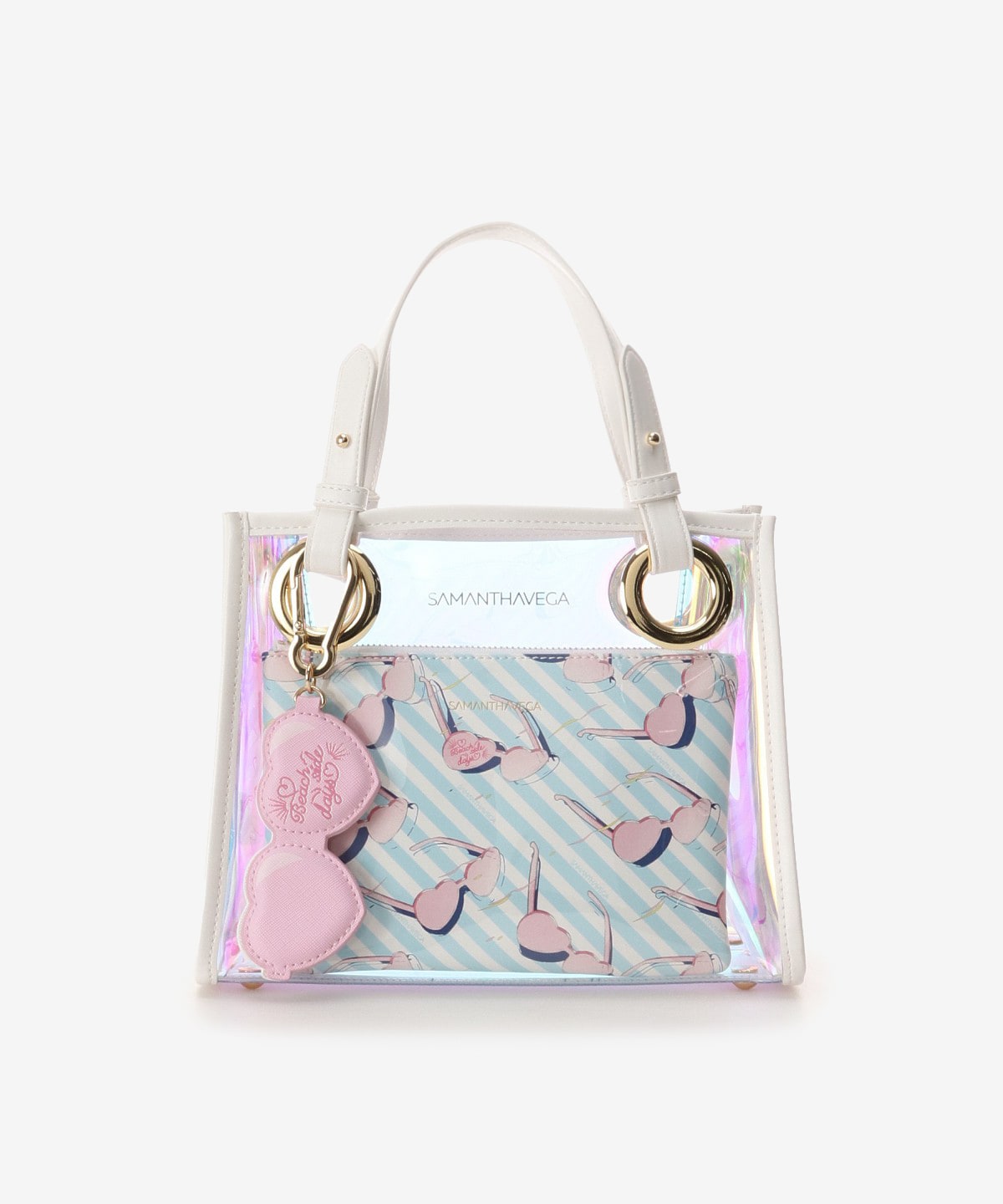 ◇SAMANTHAVEGA(サマンサベガ)のクリアバッグサマンサベガで人気のスクエア型トートバッグから新しくクリア素材が登場。長財布やペットボトルがしっかり入るサイズ感で、セットのポーチは単体でもバッグインバッグとしてもお使い頂けます。また付属のショルダーをつけて肩掛け・斜め掛けでも使えるので、夏のお出かけにぴったりのバッグです。オーロラ素材で華やかな印象に★サングラスモチーフのチャームもついているので友達の目を引くこと間違いなし!夏のお出かけのお供にぴったりのバッグです!