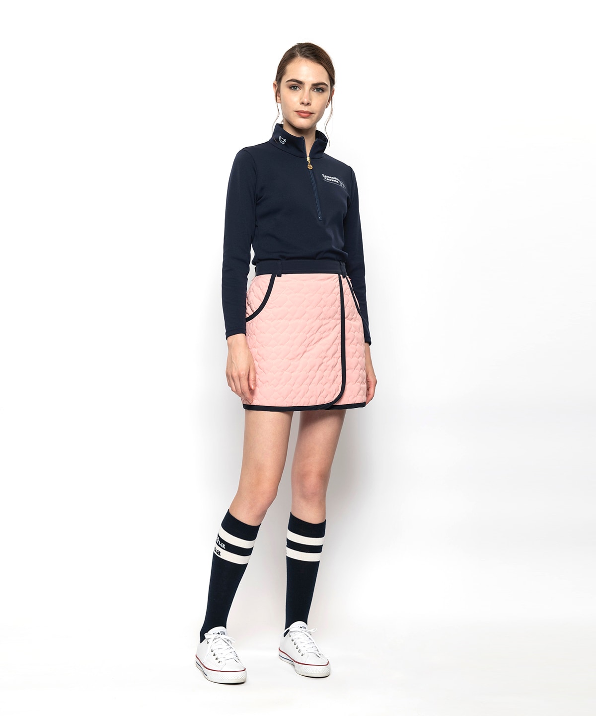両サイドには縦にロゴが入っており、腕を動かすたびにロゴがチラッと見えるので、可愛いハートのキルトながらスポーティーさも掛け合わせてるハイブリットなデザインです!