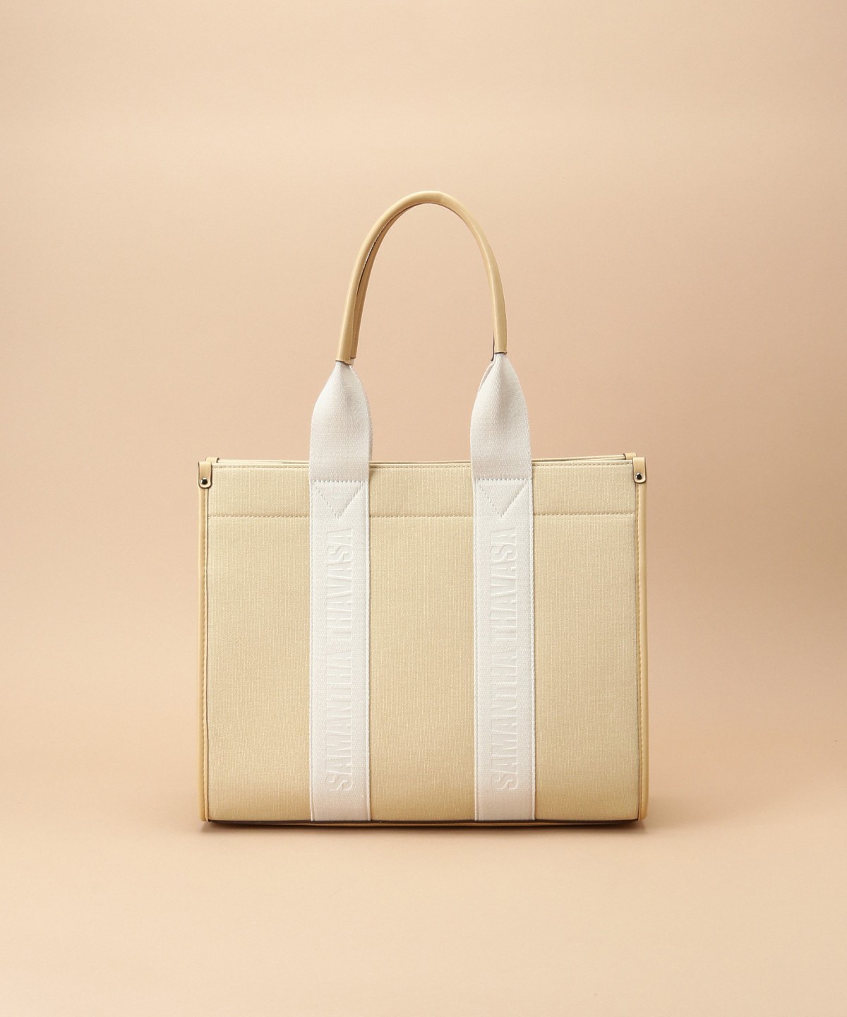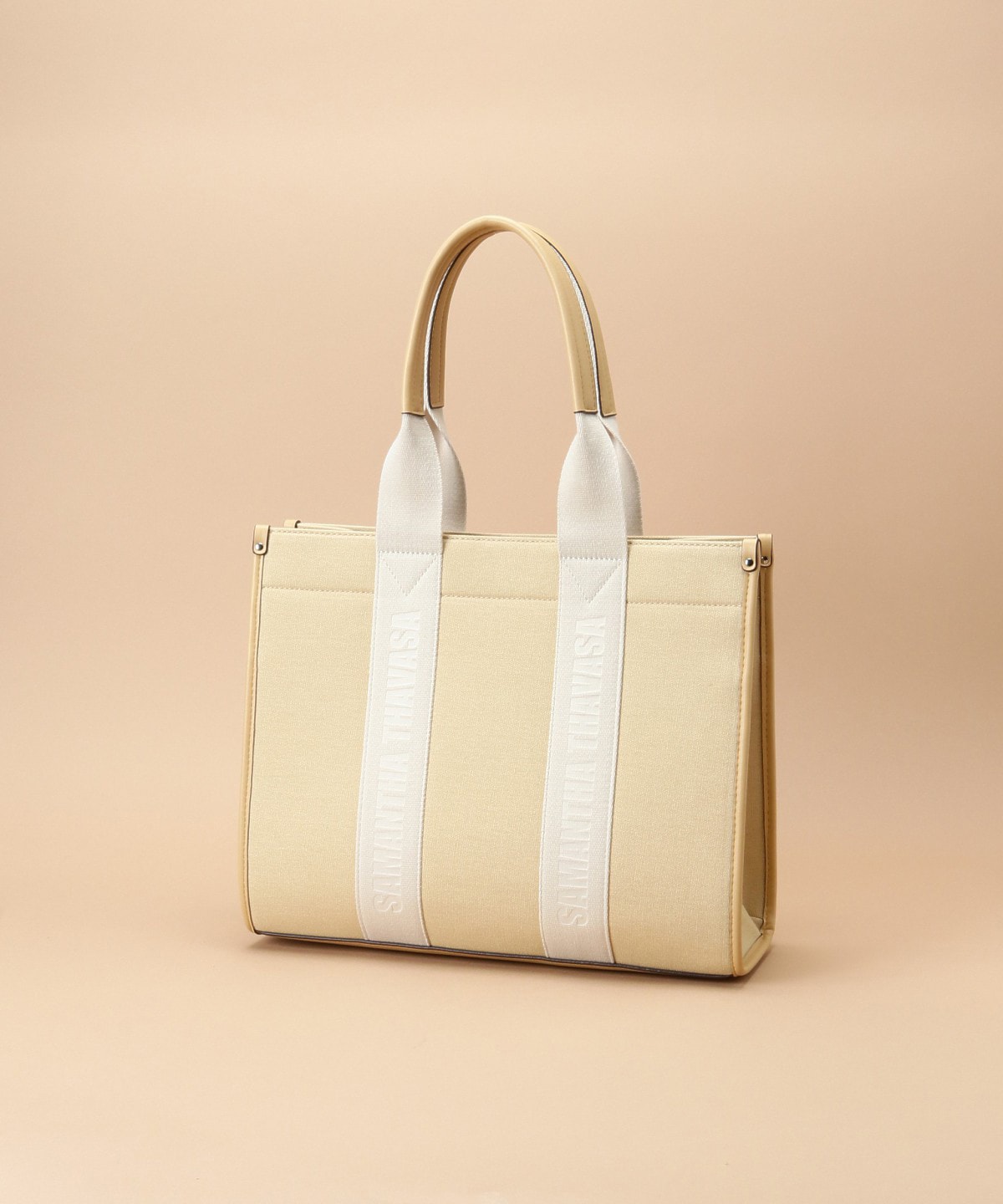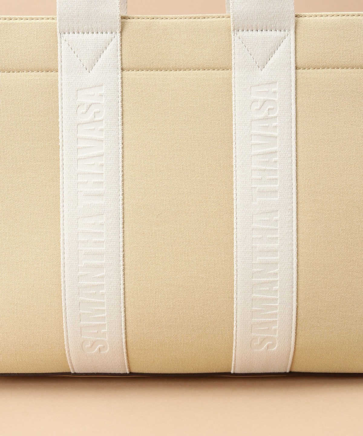 SAMANTHA THAVASAのロゴをハンドルテープにエンボスしたキャンバストートバッグ。