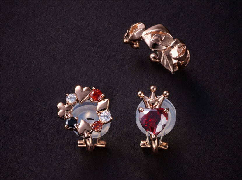 大き目のハートストーンには「リドル」を連想させるティアラを添えました。ラウンドフォルムのピアスの中にハート・スペード・ダイヤ・クラブやイメージカラーのストーンを。ピアスやイヤーカフ、イヤリングでコーディネートを楽しめます。イヤリングに使用している金具はバネ式のクリップタイプです。