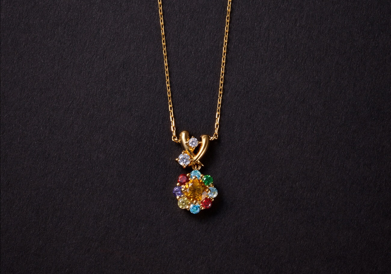 寮のカラーでもあるメインのオレンジストーンのサイドにも、ビーズのアクセサリーをイメージしたカラーストーンを配置。