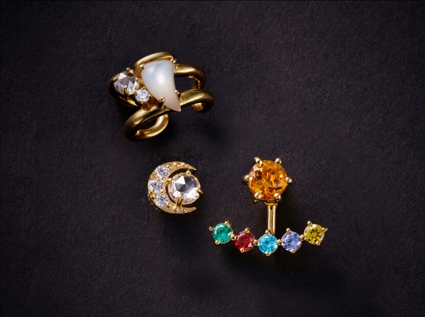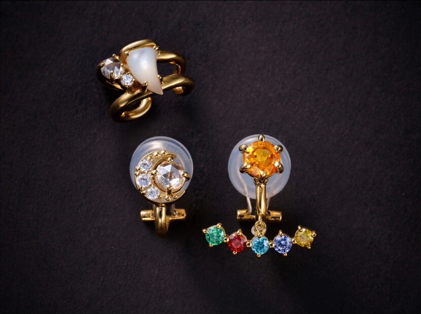 ピアスとイヤリングのポスト部分には寮カラーでもあるオレンジストーンを配置し、耳下部分に装飾品をイメージしたカラーストーンを添えています。宝石をイメージした立体的なクリアストーンを三日月の中に配置し、キラキラと煌めくピアス。ピアスやイヤーカフ、イヤリングでコーディネートを楽しめます。イヤリングに使用している金具はバネ式のクリップタイプです。