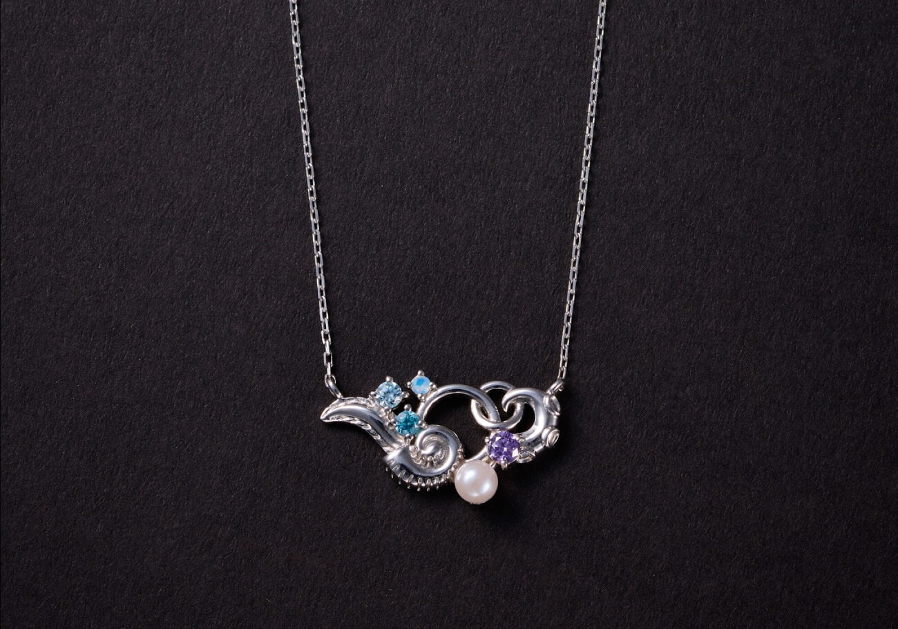 中央部分には泡をイメージしたリング(輪)やグラデーションのブルーのストーンを配置し、さらにパールなどでも世界観を表現したネックレスです。