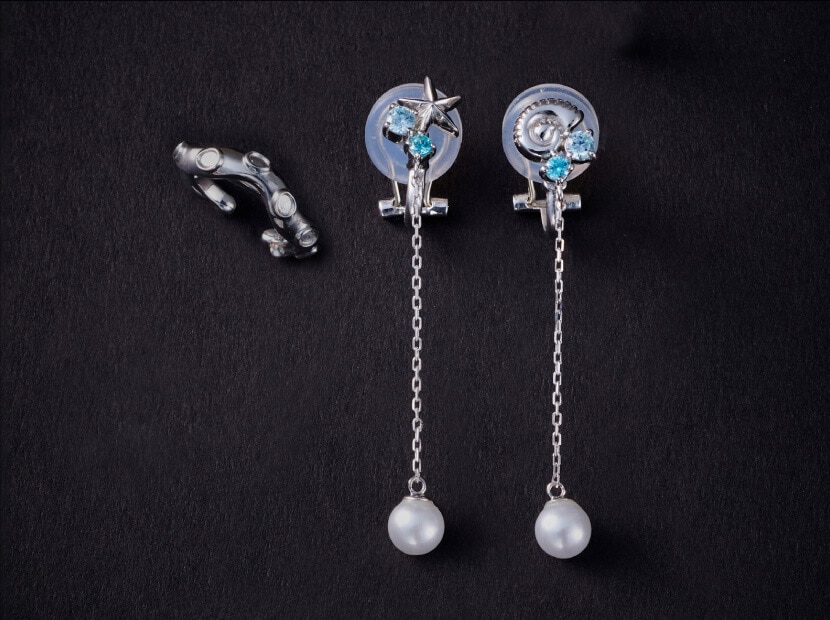 ヒトデや貝のモチーフをアクセントに泡をイメージしたブルーのストーンを配置したピアスとイヤリング。ぶら下がるパールはゆらめく海の中をイメージさせ、世界観を演出してくれます。ピアスやイヤーカフ、イヤリングでコーディネートを楽しんで。イヤリングに使用している金具はバネ式のクリップタイプです。