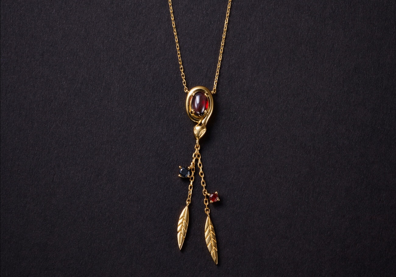 寮生をイメージさせるハート、剣、毒リンゴ、クジャクの羽をモチーフにしたネックレス。ハートのストーンは剣に、毒リンゴのメタル、クジャクの羽の中央部分には羽をイメージさせるカラーストーン、繊細にデザインされたモチーフに、鮮やかなストーンの色味をプラスしてさらに「ポムフィオーレ寮」の華やかな世界観を表現しました。