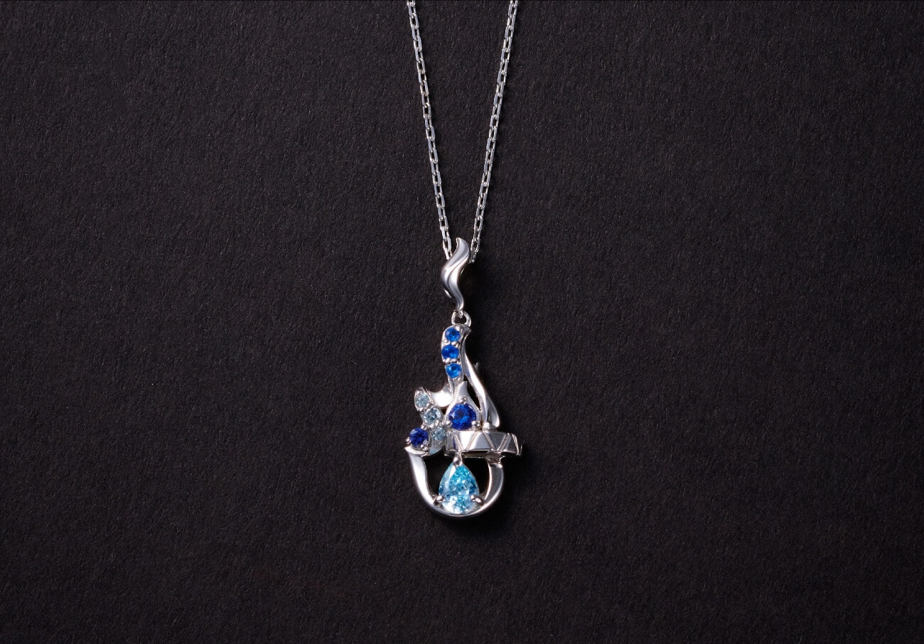 炎を連想させるフォルムに、メインカラーでもあるブルーのストーンを合わせて青い寮の世界観を表現。うねりやひねりを加えながら、炎を表現。三角プレートを重ねたモチーフを配置し、炎の中にシャープな印象をプラスさせたネックレスです。