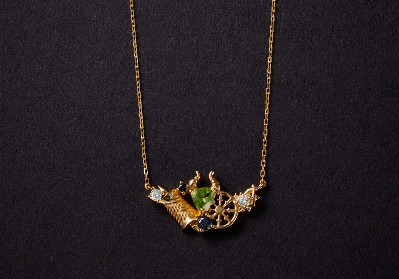 「マレウス」をイメージした角を中央に、寮を連想させる糸巻きや滑車、茨をモチーフにしたネックレス。