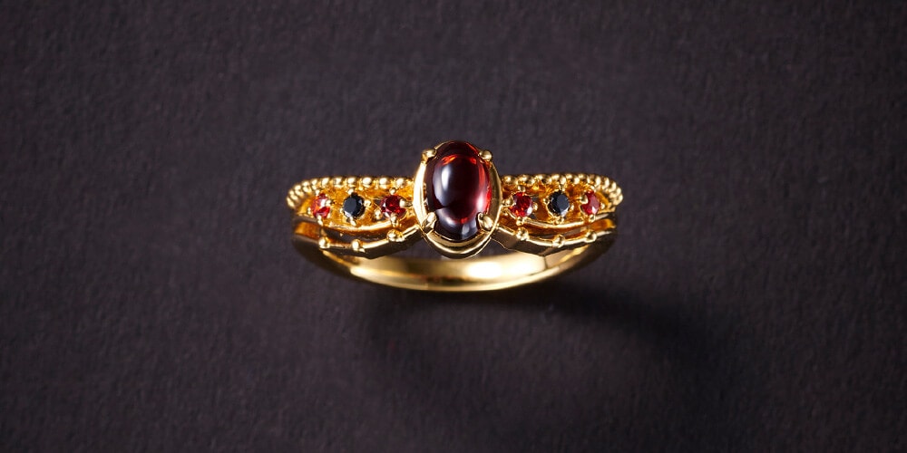 「カリム」の髪飾りをイメージしたリング。髪飾りにも使用されている丸みのある赤いストーンをメインに、緩やかで繊細なラインと寮カラーのストーンを均等に配置したアシンメトリーデザイン。