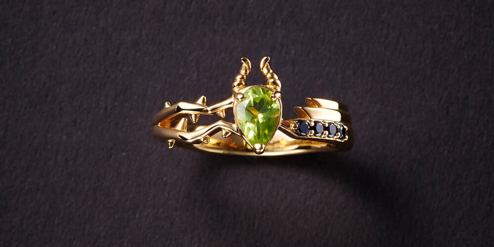 「マレウス」の角を黄緑のメインストーンの上に配置し、2色のカラーストーンで世界観を表現。