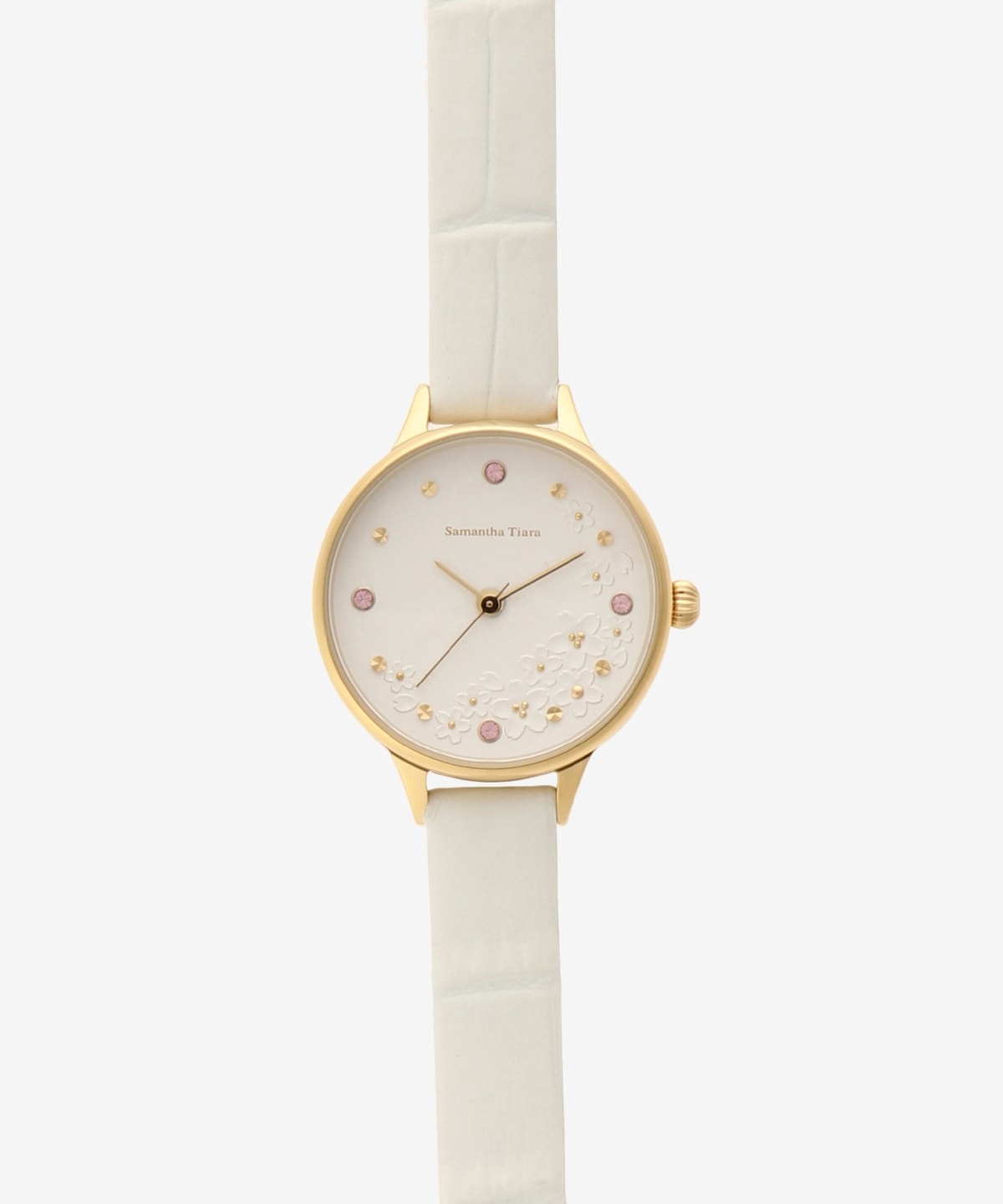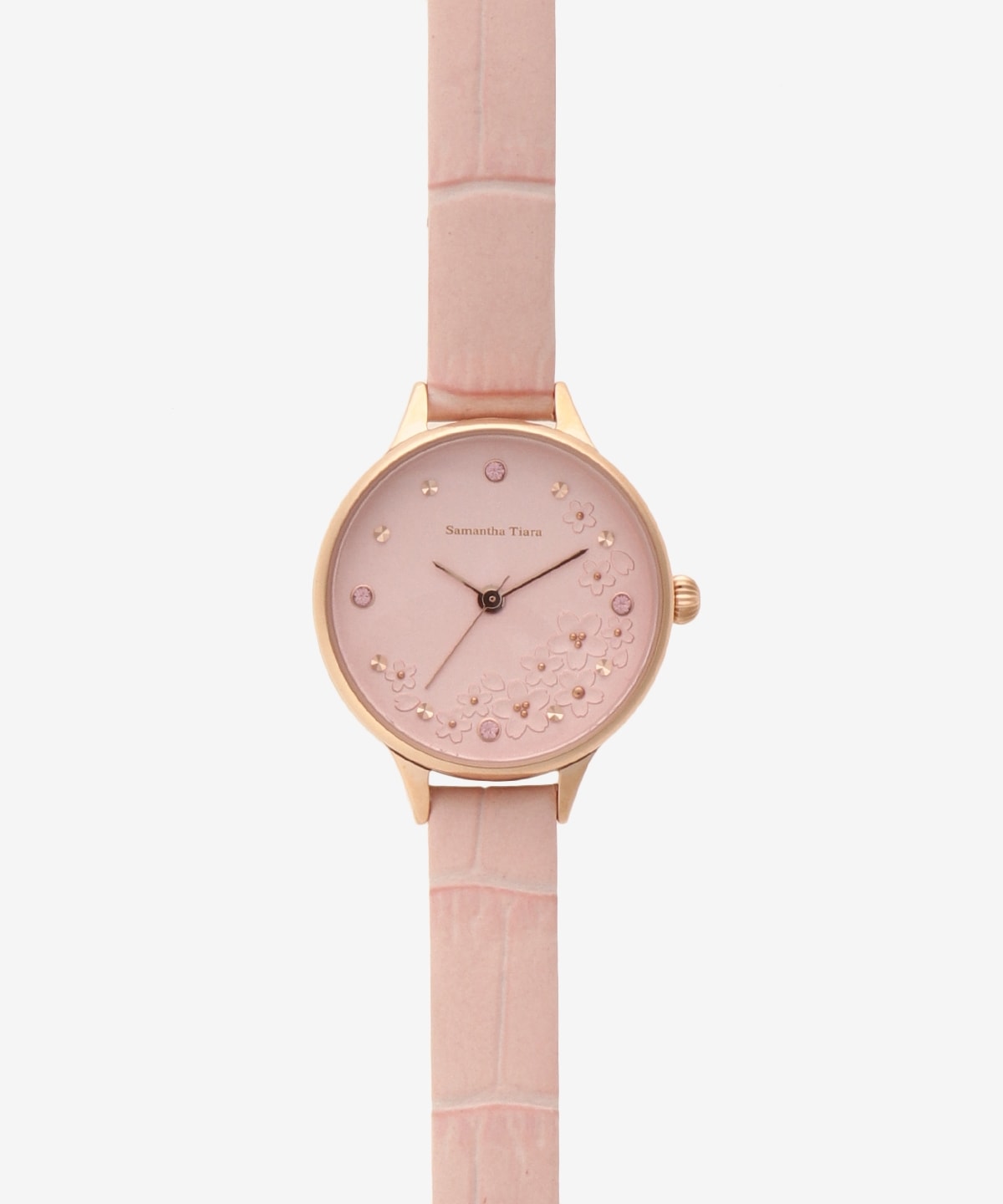 マット感のある文字盤に咲き誇る桜の花が印象的な時計。 |